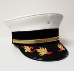 Bell Crown Cap in White Grained with convertible black velvet frame and 6-Flame embroidered visor. The black braid can be removed to reveal the ventilated mesh frame.