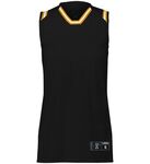 100% polyester wicking smooth knit with color secure(r) technology that helps prevent dye migration * Dry-Excel(tm) Micro-Interlock smooth 100% polyester knit inserts * Wicks moisture * Ladies' fit * Updated tailored fit * Tag-free label * Outside locker label * Modified V-neck collar * Designed to be NFHS compliant