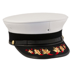 Bell Crown Cap in White Grained with convertible black velvet frame and 6-Flame embroidered visor. The black braid can be removed to reveal the ventilated mesh frame.