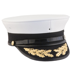 Bell Crown Cap in white grain material with convertible black braid frame and U.S. Army Permagold oak leaf embroidered visor. The black braid can be removed to reveal the ventilated mesh frame.